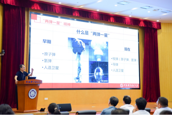 杜江峰还讲述了“两弹一星”与中国科大不可分割的历史渊源。“两弹一星”是创办科大的动因,抓尖端科学技术为国家建设服务是科大的主要任务。建校初期的13个系,全部围绕“两弹一星”设置,坚持服务国家战略目标需求;南迁合肥后,科大继续发扬“两弹一星”精神,艰苦奋斗、自力更生,完成了二次创业。可以说,科大精神就是“两弹一星”精神的传承,“两弹一星”精神更是科大的本色!