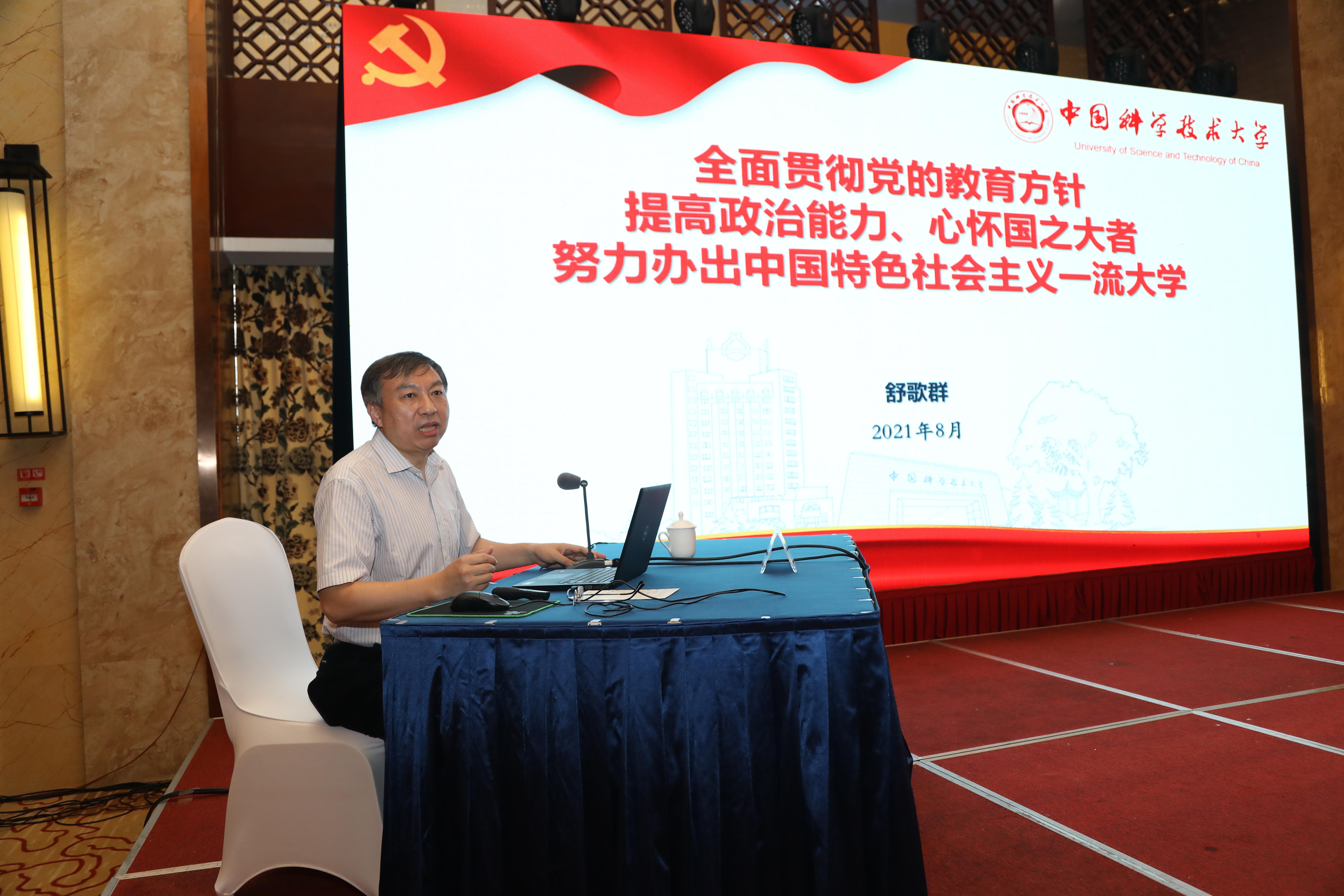舒歌群书记作题为《全面贯彻党的教育方针 提高政治能力、心怀国之大者 努力办出中国特色社会主义一流大学》的专题党课,带领与会人员重温习近平总书记“七一”重要讲话,学习中共中央宣传部8月26日发布的文献《中国共产党的历史使命与行动价值》,从“学党史——深入学习习近平总书记‘七一’重要讲话”“明方向——全面贯彻落实新时代党的教育方针”“强基础——提高干部政治能力,加强党的政治建设”“建新功——心怀国之大者,打造国家战略科技力量”四个方面进行讲授。舒歌群书记在总结中强调,一是要深入学习领会习近平总书记“七一”重要讲话精神,在理论学习中不断提升政治能力;二是要抓好中央巡视整改,在严格的党内政治生活锻炼中不断提升政治能力;三是要心怀“国之大者”,在服务大局的实践中不断提升政治能力。