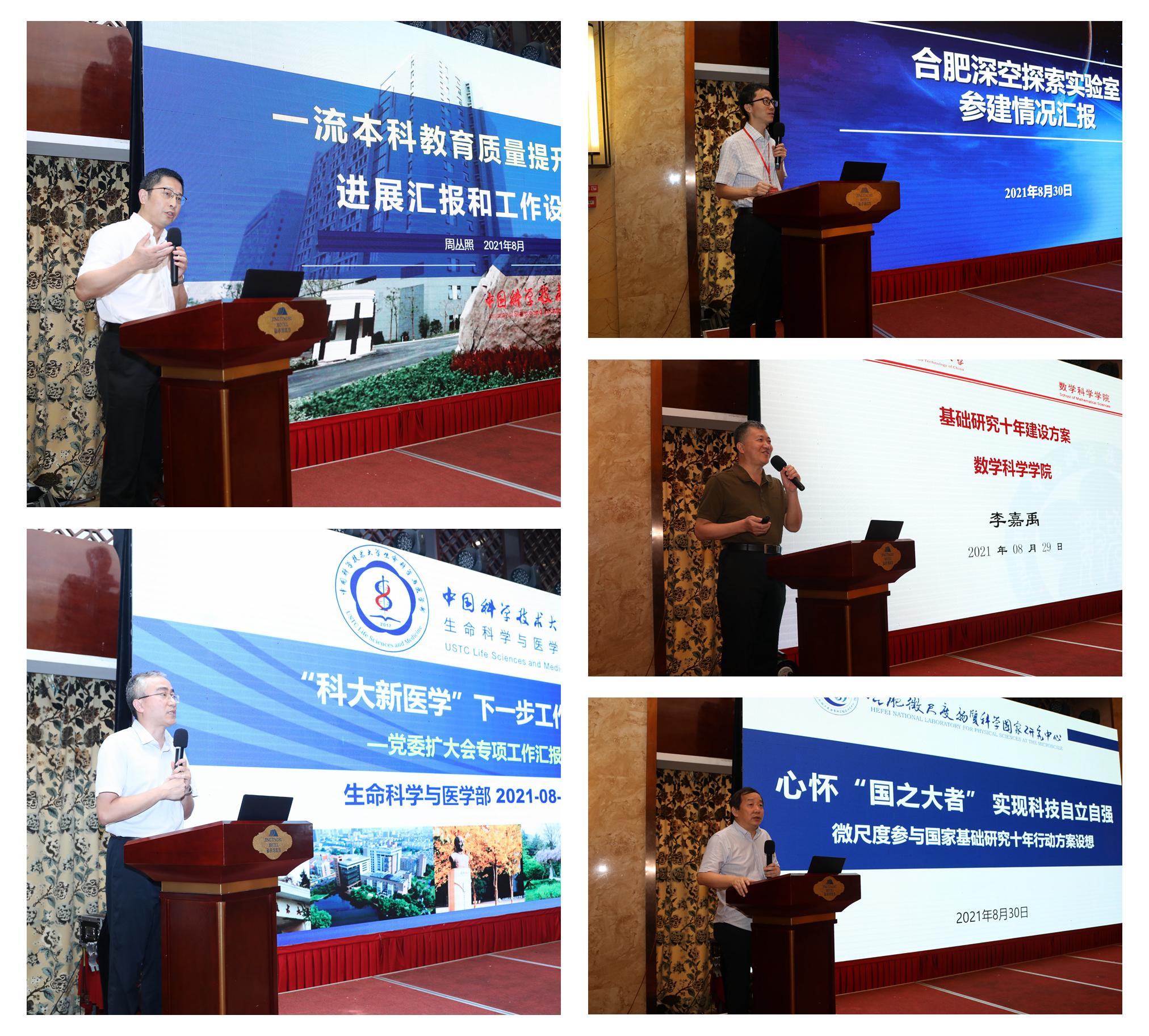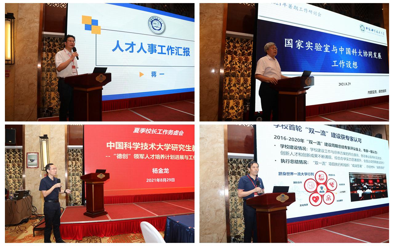 暑期工作研讨会上,党委常务副书记蒋一汇报人才队伍建设情况,党委常委、副校长朱长飞汇报国家实验室与中国科大协同发展工作设想,副校长杨金龙汇报“德创”领军人才培养计划工作设想,党委常委、副校长罗喜胜汇报“双一流”建设情况及工作设想,校长助理、教务长周丛照汇报“一流本科教育质量提升计划”行动纲领工作设想,生命科学与医学部执行部长薛天汇报“科大新医学”工作设想,地球和空间科学学院执行院长汪毓明汇报深空探索实验室参建情况,数学科学学院执行院长李嘉禹、合肥微尺度物质科学国家研究中心主任罗毅汇报参与国家基础研究十年行动方案设想。在听取汇报后,与会人员就各专项工作展开热烈讨论,校领导结合学校创新改革发展实际一一点评,并对各专项工作发展提出具体意见和建议。