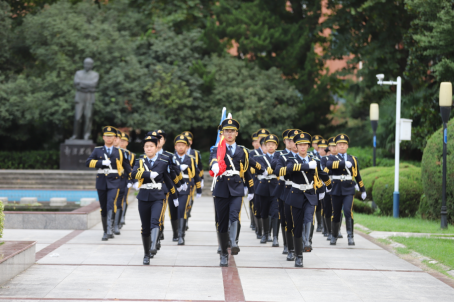 “现在是北京时间早晨7点整,出旗!”随着校学生国旗护卫队同学的一声口令,由新生组成的三十人升旗仪仗队迈着坚定有力的步伐,整齐划一地护卫着鲜红的国旗和蓝色的院旗、校旗迈向升旗台。