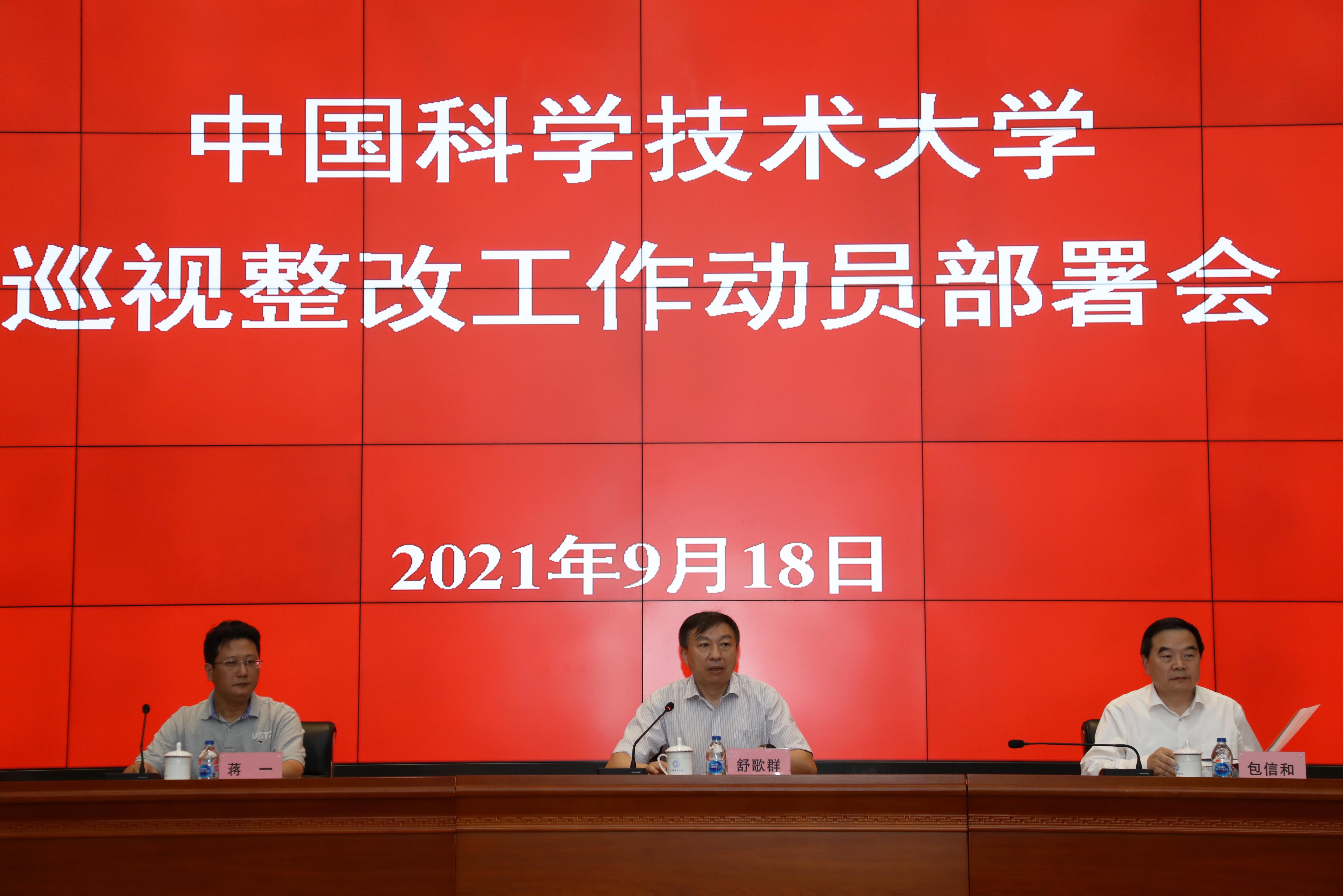 9月18日下午,中国科学技术大学召开巡视整改工作动员部署会。校巡视整改工作领导小组组长、校党委书记舒歌群主持会议并讲话,校巡视整改工作领导小组组长、校长包信和出席会议并讲话,校党委常务副书记蒋一部署巡视整改工作方案,校领导朱长飞、王晓平、毕金初、傅尧、黄素芳、周丛照出席会议,全体中层干部参加会议。