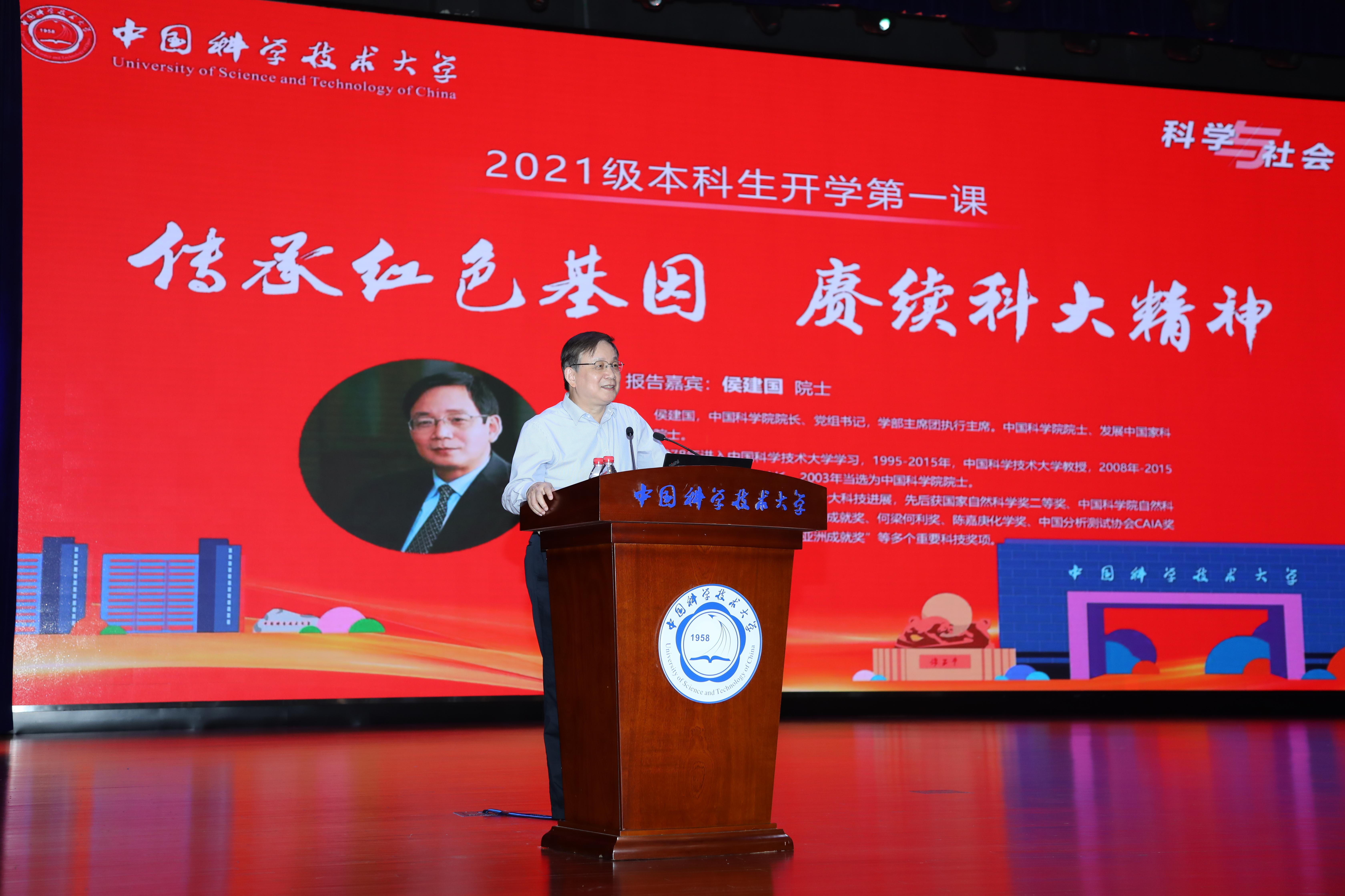 9月22日晚,中国科学院院长、党组书记侯建国以“传承红色基因、赓续科大精神”为题,向中国科学技术大学1900余名2021级本科新生讲授“科学与社会”研讨课的“开学第一课”。中国科大校长包信和主持研讨课。