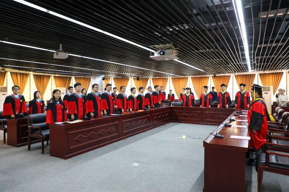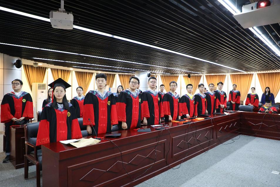 “迎接着永恒的东风,把红旗高举起来,插上科学的高峰……”宣誓之后,现场师生一起高唱校歌《永恒的东风》,歌声响彻整个会场。罗毅依次为毕业生扶正流苏,并合影留念。
