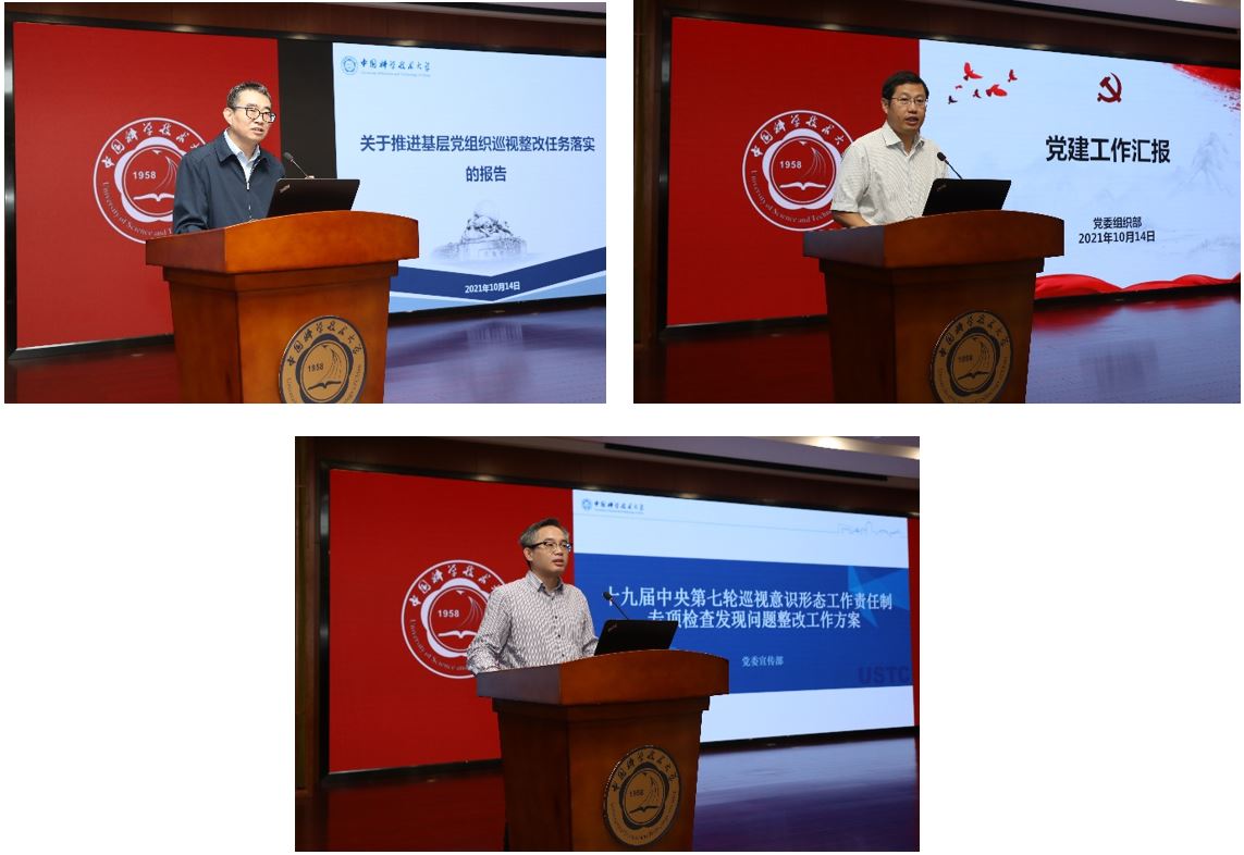 会上,党政办公室主任、机关党委常务副书记王伟作了关于推进基层党组织巡视整改任务落实的报告;党委组织部常务副部长邓建松通报了学校党建工作进展,并对近期党建工作任务作了提醒;党委宣传部常务副部长朱霁平报告了中央巡视意识形态工作责任制专项检查发现问题整改工作方案,并对“我为师生办实事”实践活动近期工作任务作了安排。