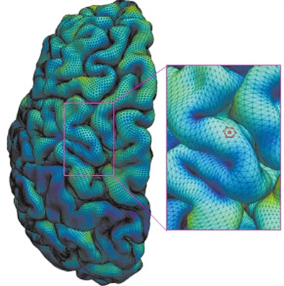 大脑皮质表面由三角形网格表示。每个顶点(例如,红色点)的表面积是其一环相邻三角形(红色六边形)的总表面积的三分之一。图片来源:美国北卡罗来纳大学医学院