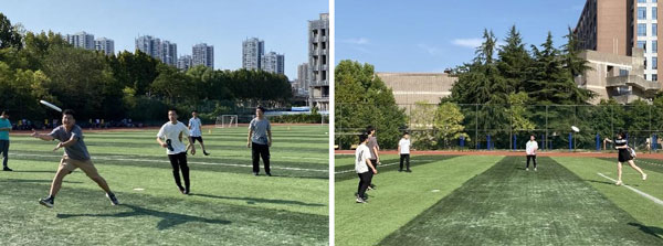 惬意的午后、绿茵的操场,一场飞盘大战紧接着开始。欢乐的飞盘接力迅速拉近了两个班级团支部同学们之间的距离。不论技艺熟练与否,每位同学都积极参与,不断尝试、摸索节奏,互相加油助威,在汗水与欢乐中,强身健体,收获友谊。