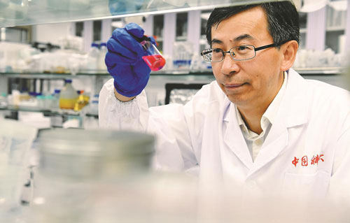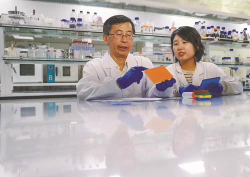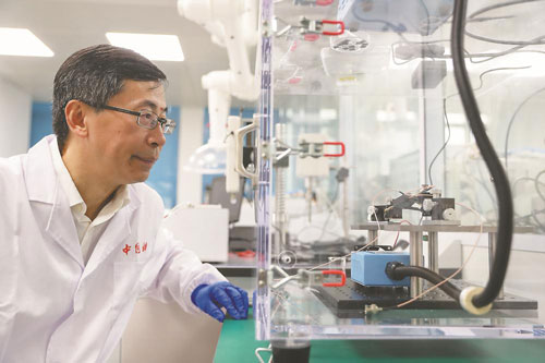 俞书宏院士在仿生矿化实验室观察人工矿化合成的仿生新材料。
