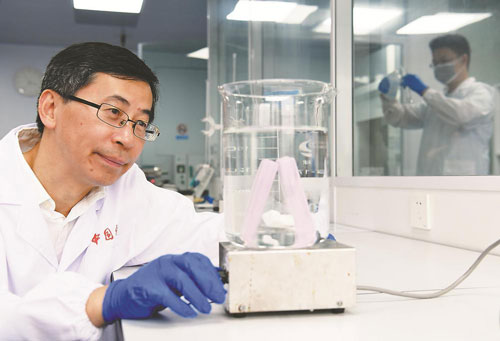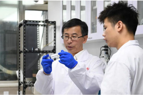 俞书宏院士在仿生材料实验室指导研究生开展仿生生物医用材料研究。
