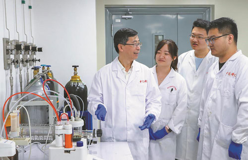 俞书宏院士在化学合成实验室为学生讲解实验仪器的使用规范。