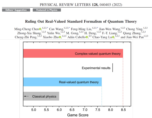 潘建伟团队在国际上率先开展了对实数量子力学的一系列检验。2021年,团队基于自主研发的超导量子体系,采用了I形的Transmon量子比特设计来增加量子比特之间的间距,以减少在同一个超导芯片上的比特之间的近邻耦合。通过高精度的量子操控技术,两个纠缠脉冲序列用于制备两对纠缠态,将量子比特分发给参与的三方。每一方各自独立选择要在其量子位上执行的测量操作,包括一个完整的贝尔态测量。最后,根据测量结果的联合统计分布计算量子博弈游戏的分数,仅用实数的参与者最多可以获得7.66分,而实验结果显示,由4个超导量子比特组成的三方参与者可以获得8.09(1)分,以超过判据43个标准差的实验精度首次证明了复数在标准量子力学形式中的必要性。