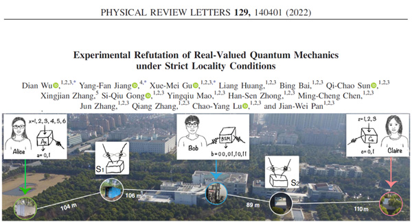 图5:严格非定域实数量子力学检验实验装置图。实验三方处于类空间隔,满足严格的爱因斯坦非定域性条件。来自吴典、江扬帆、顾雪梅等PRL129,140401 (2022)。