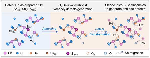 近日,中国科学技术大学陈涛教授课题组在硒硫化锑点缺陷性质研究中取得进展。该团队通过深能级瞬态谱技术探测温度驱动的硒硫化锑点缺陷特性,再结合退火过程中材料组分变化,揭示其点缺陷的形成和演化机制。研究发现:初始水热沉积导致高形成能点缺陷的形成,这是在水热条件下驱动离子随机沉积的结果;后退火及薄膜的结晶过程导致硫和硒阴离子的损失并产生空位缺陷(VS(e));由于阳离子/阴离子反位缺陷形成能较低,锑离子迁移并填充阴离子空位,最终形成SbS(e)反位缺陷(如下图)。该缺陷演化机制为设计薄膜制备方法以抑制深能级点缺陷的形成提供了关键参考依据。相关成果以“Thermal-Driven Point Defect Transformation in Antimony Selenosulfide Photovoltaic Materials”为题发表于Advanced Materials。