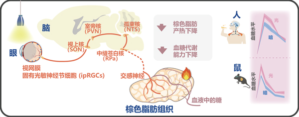 图“眼-脑-棕色脂肪轴”介导光调节血糖代谢神经机制。光通过视网膜固有光敏神经节细胞(ipRGCs),传递光信息到下丘脑视上核(SON),然后传递至下丘脑室旁核(PVN),脑干孤束核(NTS),再到中缝苍白核(RPa),最终通过交感神经支配棕色脂肪组织。光通过这一长程“眼-脑-棕色脂肪轴”的神经联系,抑制脂肪组织消耗血糖引起的产热,造成血液中的血糖过度升高,导致人和小鼠的血糖代谢能力降低。