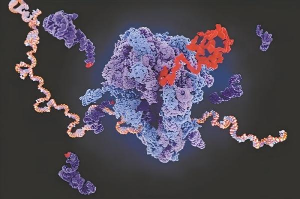 核糖体(中间)从mRNA生成蛋白质(红色)。深紫色链代表转移RNA,它们也参与蛋白质合成。图片来源:英国《新科学家》网站