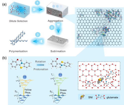 研究者们设计并合成了一种构象敏感型有机磷光探针。利用该探针,研究直接证实,即使在亚毫摩尔浓度下,氨基酸在水冰中也能形成纳米聚集体。实验中观测到由不同氨基酸触发的特异性磷光信号,其机理在于:氨基酸聚集后形成的疏水微环境会物理吸附SNI分子,诱导其采取特定的基态构象,从而产生具有构象依赖性的磷光发射。这一发现将光谱信号与微观聚集结构直接关联。