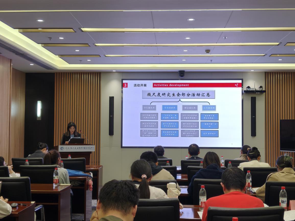 随后,第二十一届主席团成员樊丁阁作《代表资格审查报告》。紧接着,第二十一届合肥微尺度物质科学国家研究中心研会执行主席田茹心作2025-2026年度工作报告。她从成立基础、组织建设、活动开展和未来展望四个方面进行了详尽阐述,对合肥微尺度物质科学国家研究中心研究生会过去一年的具体工作进行了全方位的总结,在肯定工作成绩的同时,也指出了部分活动在创新性和宣传力度上存在的不足,并对新一届研会给出了建议和展望,勉励大家团结奋进、不断完善。随后,朱江晨宣读了关于该工作报告的决议,获全体与会代表一致表决通过。