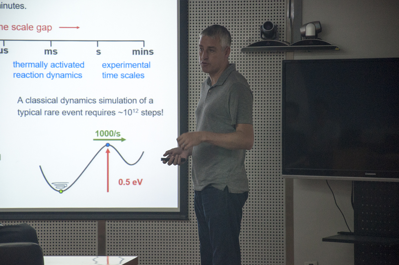应严以京教授的邀请,8月12日,德克萨斯大学奥斯汀分校Prof. Graeme Henkelman来研究中心进行学术交流与访问,并为师生们作题为“From Transition States to Dynamics over Long Time Scales”的学术报告。